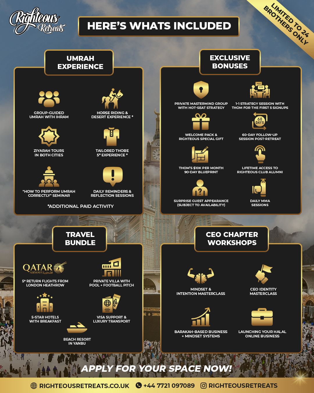 A 10-day Umrah retreat designed to give you total business clarity, a clear halal model, and a 90-day execution plan, even if you’re starting from zero or already in business.